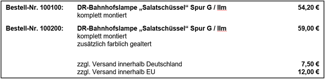 Kleinserienprodukt DR-Bahnhofslampe „Salatschüssel“ Spur G / IIm